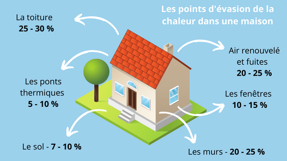 - 20 à 25 % par l’air renouvelé et les fuites (cheminée, conduits de ventilation, etc.) ;
